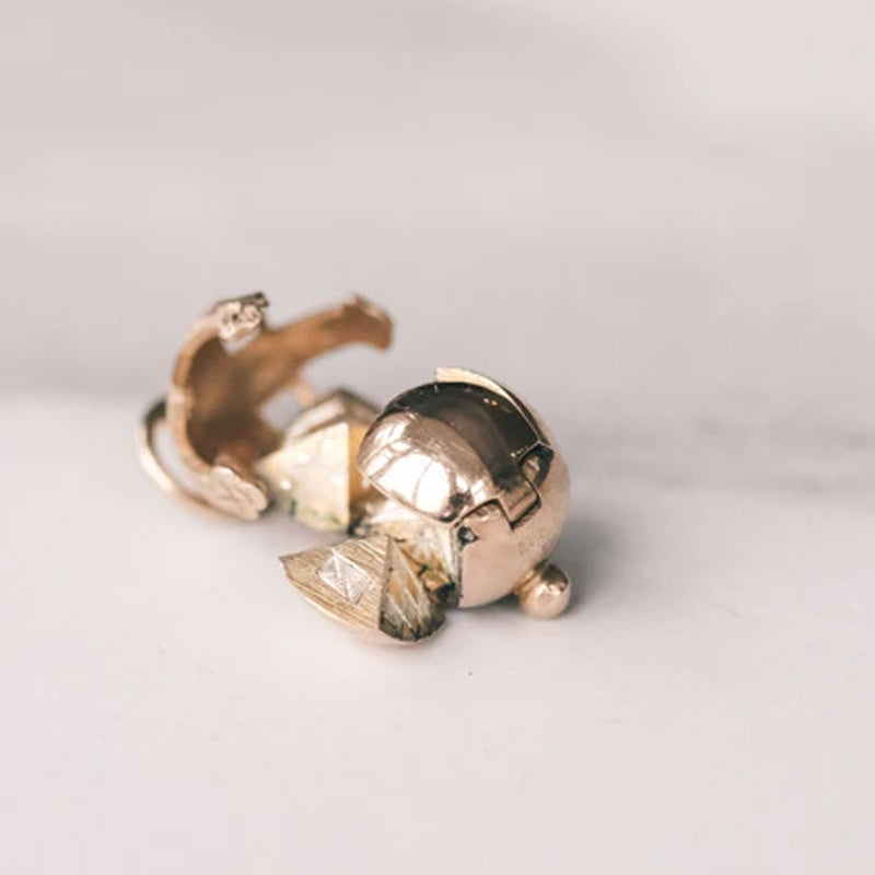 This pendant is a masterclass in vintage ingenuity! It begins as a sleek, hinged sphere – unlock the top hinge cage, and itunfolds into a cross shapewith six pyramid tips pointing upward. Each pyramid face is etched withiconic Masonic symbols– think the Square & Compasses, All-Seeing Eye, Skull & Crossbones, Star of David, and more. It’s a hidden code, a fraternal identifier, and a work of art rolled into one tiny treasure.